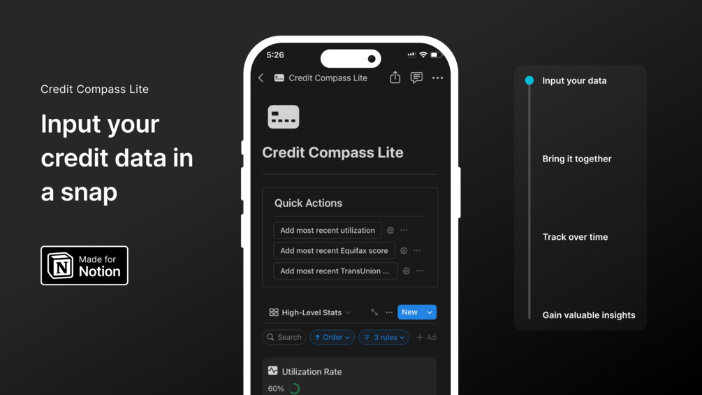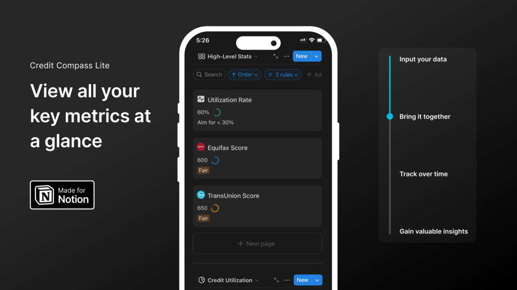 With the Credit Compass Lite, keep all your credit data in one place and track your progress over time. This template makes it easy to log your credit information and monitor your credit health.
