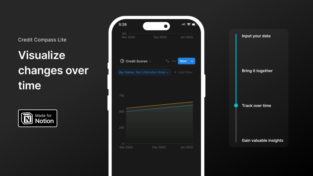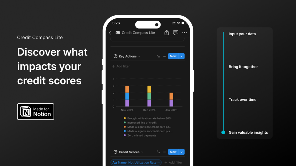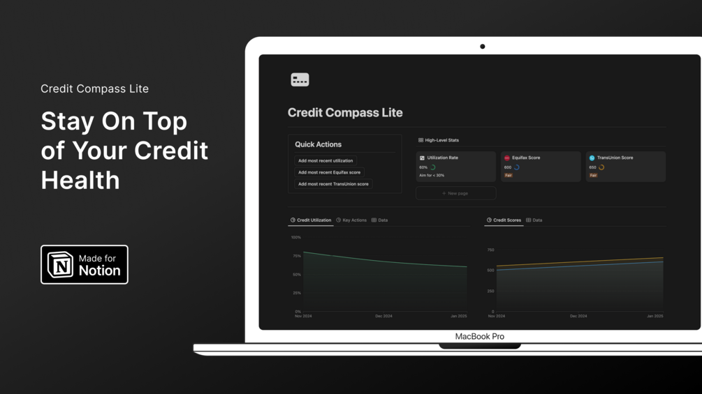 With the Credit Compass Lite, keep all your credit data in one place and track your progress over time. This template makes it easy to log your credit information and monitor your credit health.