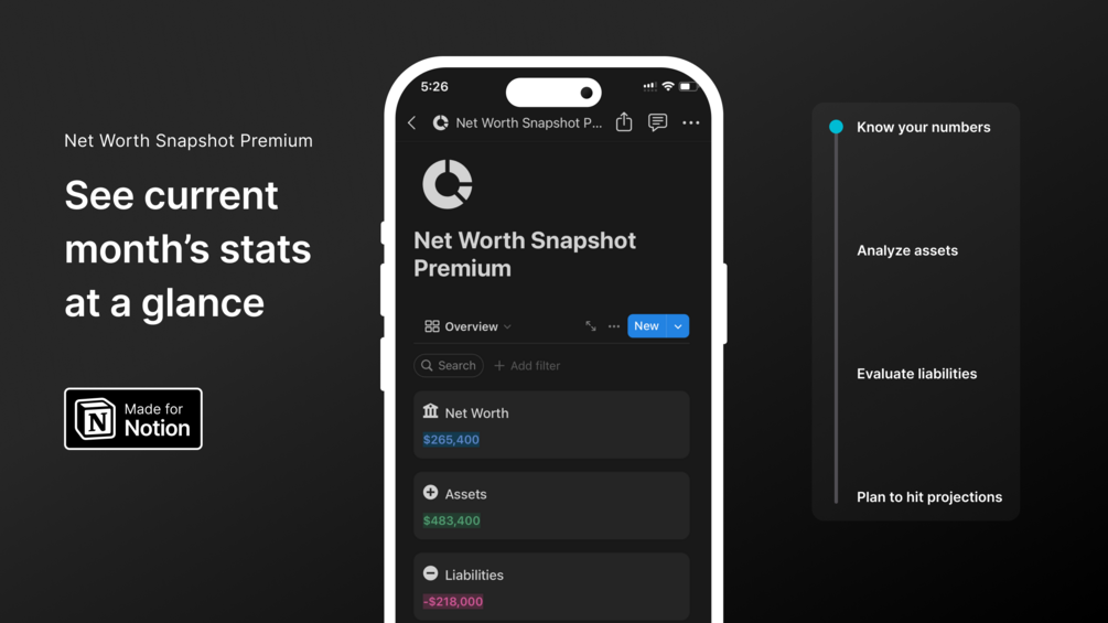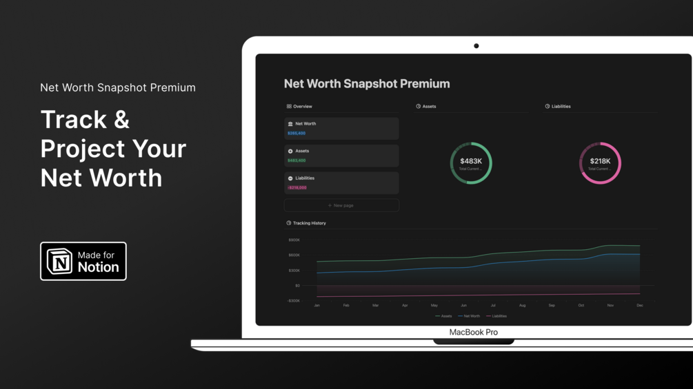 Tracking your net worth is an essential part of optimizing your financial health. With the Net Worth Snapshot Premium template, you don’t just get a clear picture of your current financial situation—you can project your financial future and track your progress over time. This template gives you the tools to make smarter financial decisions, based on both the past and future trends of your finances.