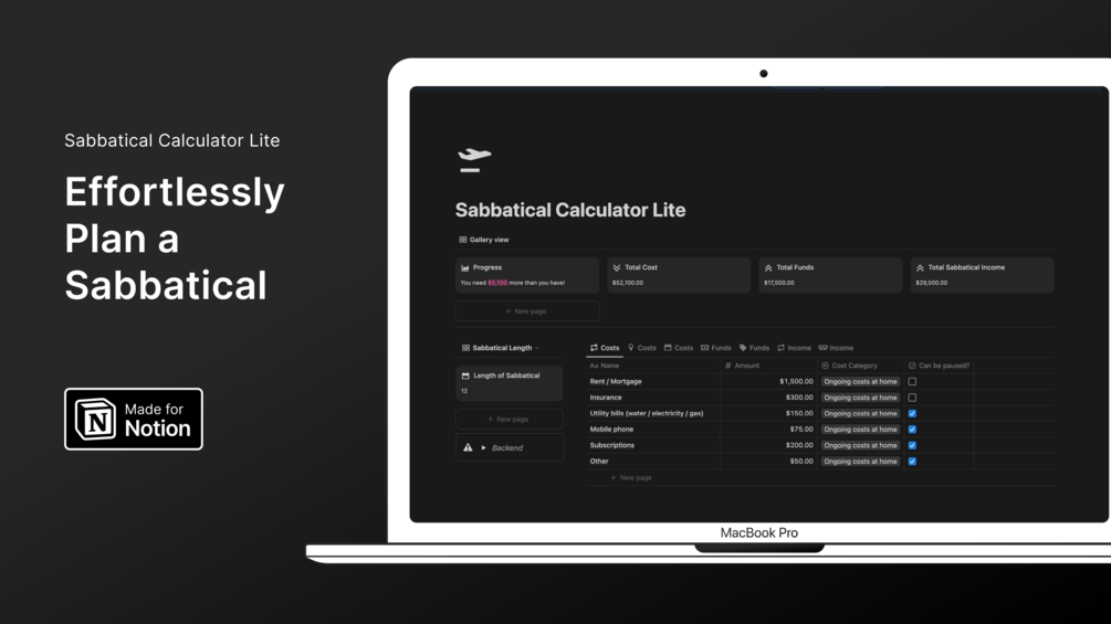 This Notion template helps you plan your sabbatical, covering everything from costs to income, so you can enjoy your time away without worrying about finances.
