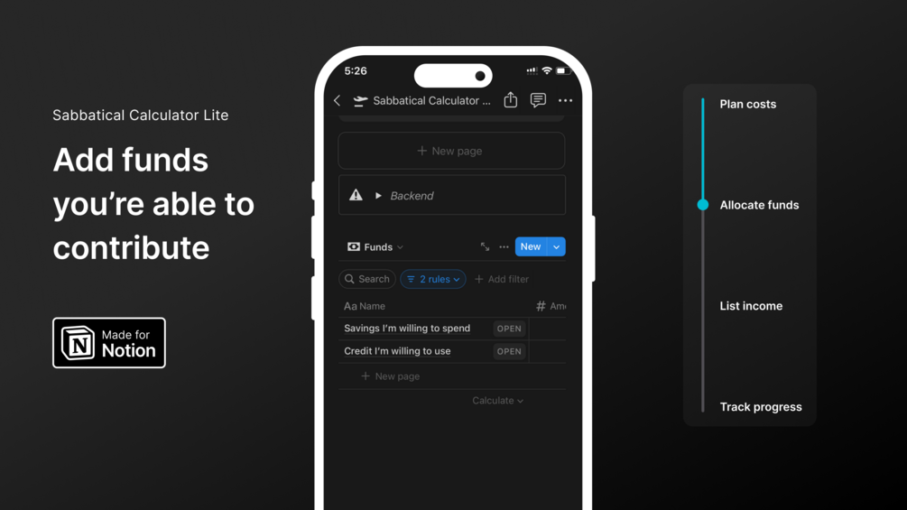 - Add Your Funds: Add any savings or credit you're willing to use during your sabbatical and any assets you’re willing to sell to help fund it.
